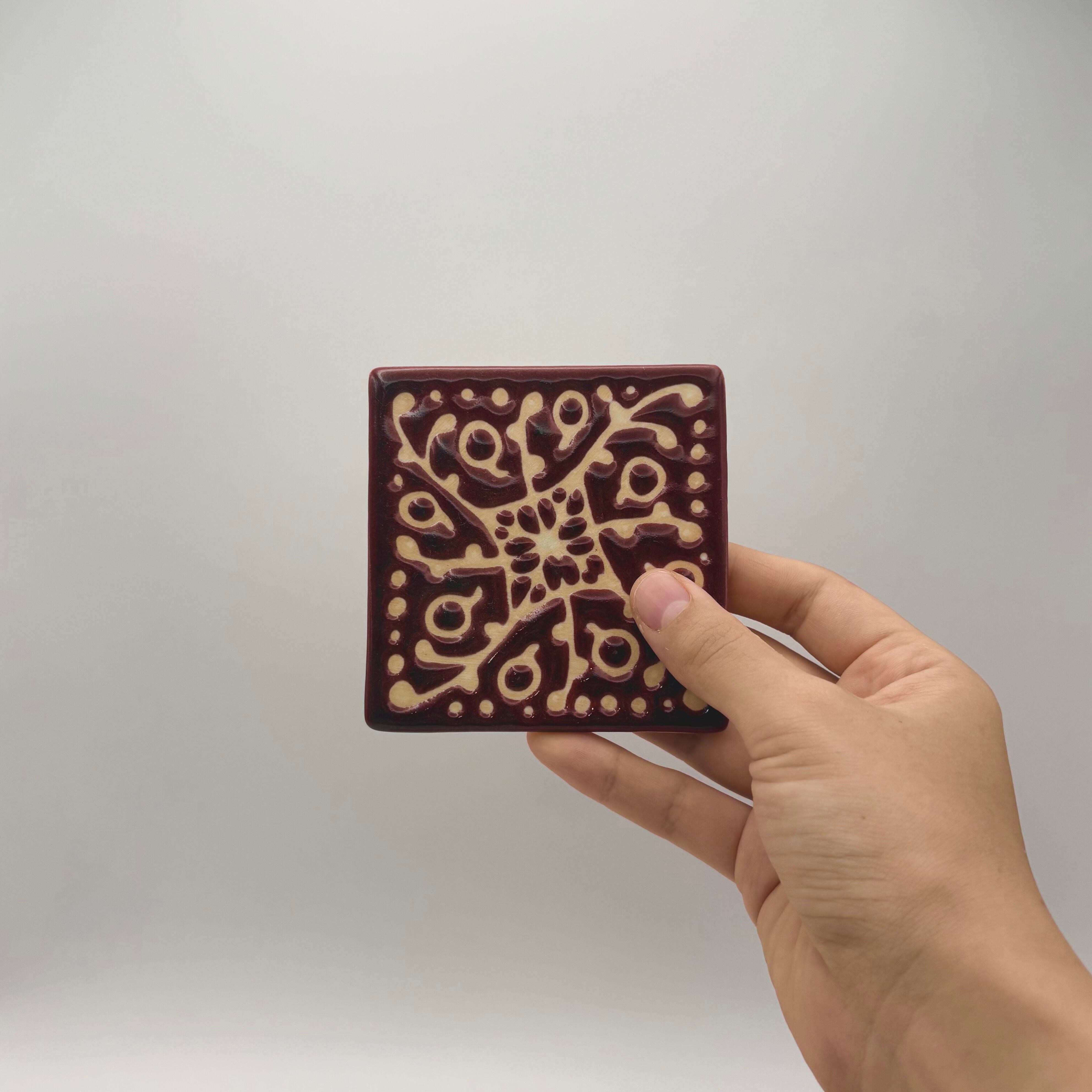 撥水剤で模様を描き、三池焼独自調合の鮮やかな釉薬をかけたタイル。
